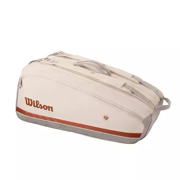 Inspirada en los colores y detalles de diseño de Roland-Garros 2025, el torneo de tenis en tierra batida más grande del mundo, el raquetero Wilson Team 6 Pack contiene de forma segura y completa hasta seis raquetas, ideal para viajar a los partidos. El amplio bolsillo para accesorios permite guardar ropa, pelotas y otros artículos, mientras que el bolsillo externo más pequeño permite guardar pequeños objetos personales. Este raquetero cuenta con una correa ajustable para el hombro, un asa superior y una presilla de cincha para colgarla.